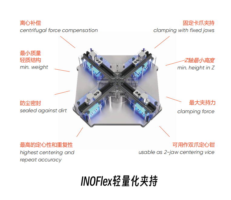 继承INOFlex®专利补偿技术,可同心夹持圆形、方形及不规则几何工件,尤其擅长处理变形敏感、薄壁零件。