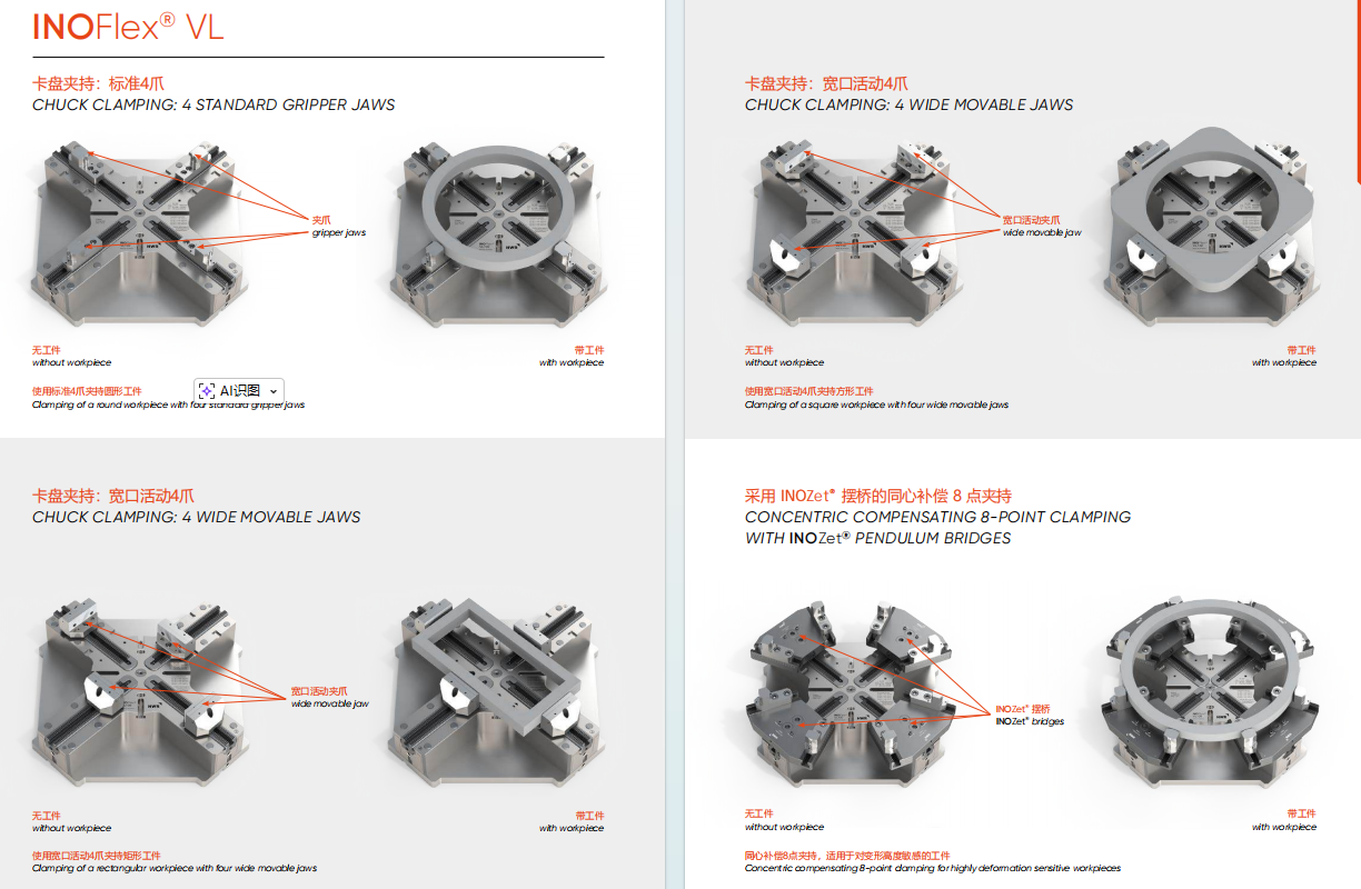 可与INOZet®摆桥系统组合,实现6爪或8爪补偿夹持,进一步提升夹持点分布均匀性,适用于超薄壁与高精度零件。