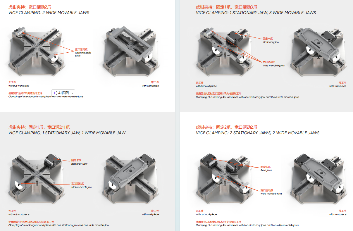 - 补偿机制:四爪同步补偿,确保各夹持点受力均匀,避免过定位与工件变形。